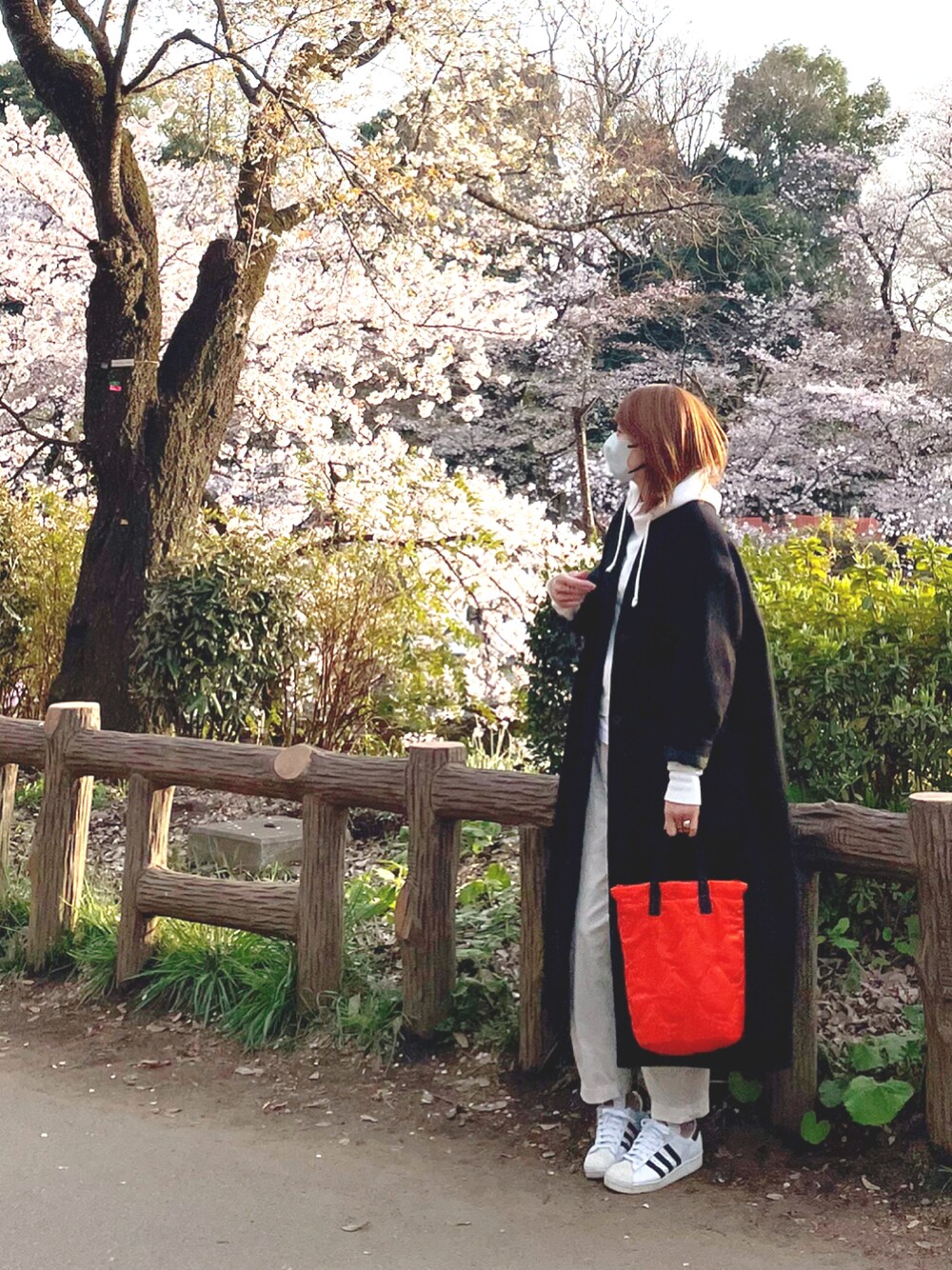ギリギリ間に合った花見🌸 最近寒くてコート引っ張り出しました。カラフルバックで明るめに🥺