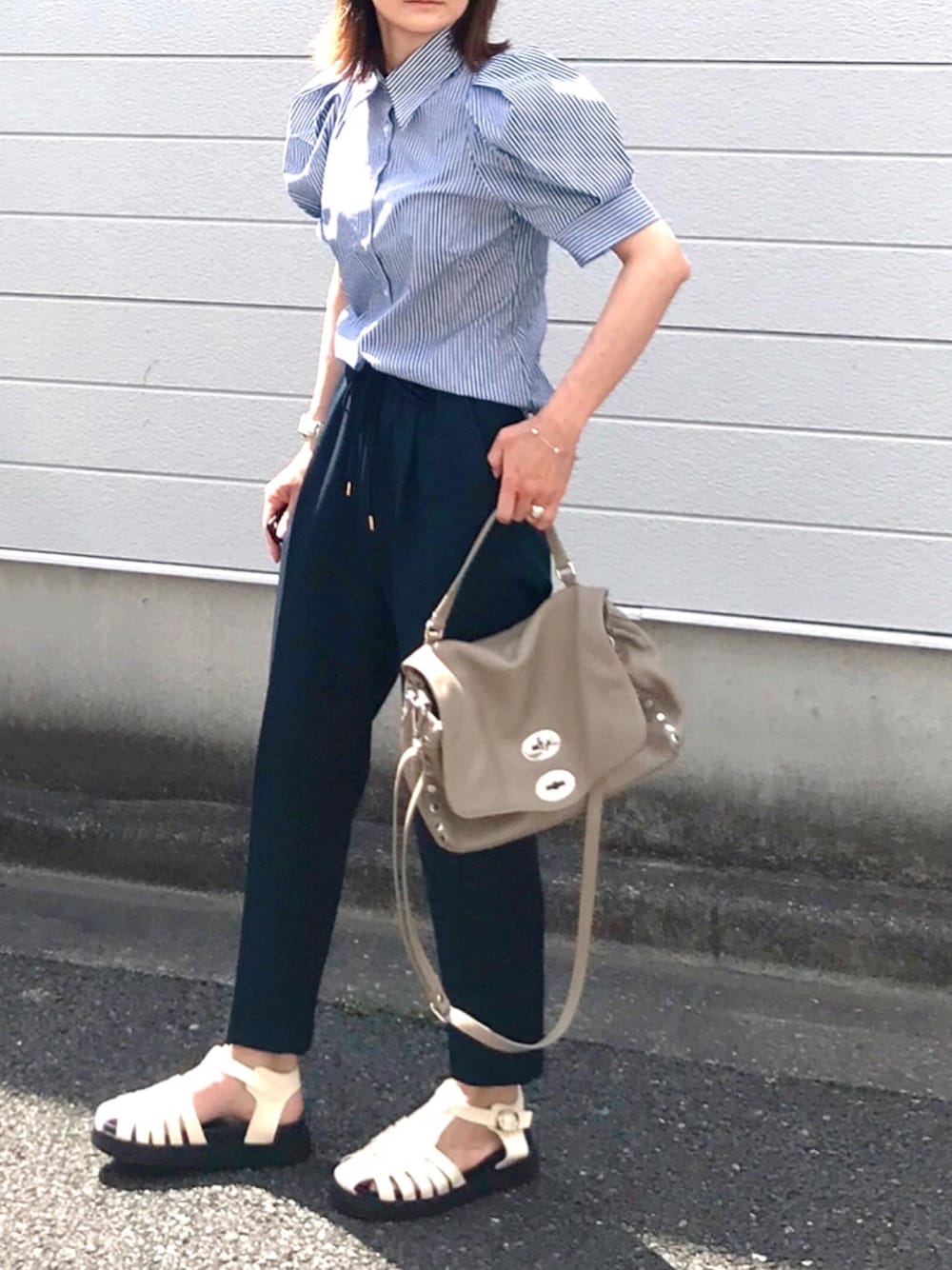 めちゃくちゃ可愛いパフスリーブブラウス見つけたよ 落ち着いたネイビー&ストライプで、大人でも抵抗なく着られます◎