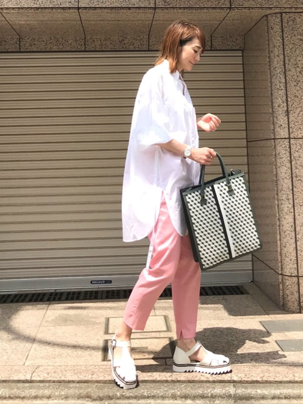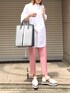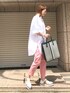 カラーパンツコーデ シンプルコーデのポイントになる柄トート🛍 お気に入り!