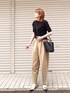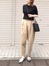 黒✖️チノベージュ 間違いない組み合わせ◎ オパーククリップのケーブル編みニットプルオーバー、二の腕の細見えが凄い!袖の長さが良いのかしら? 38サイズ着用してます◎ Tシャツよりキチンとした印象が欲しい時に大活躍です◎