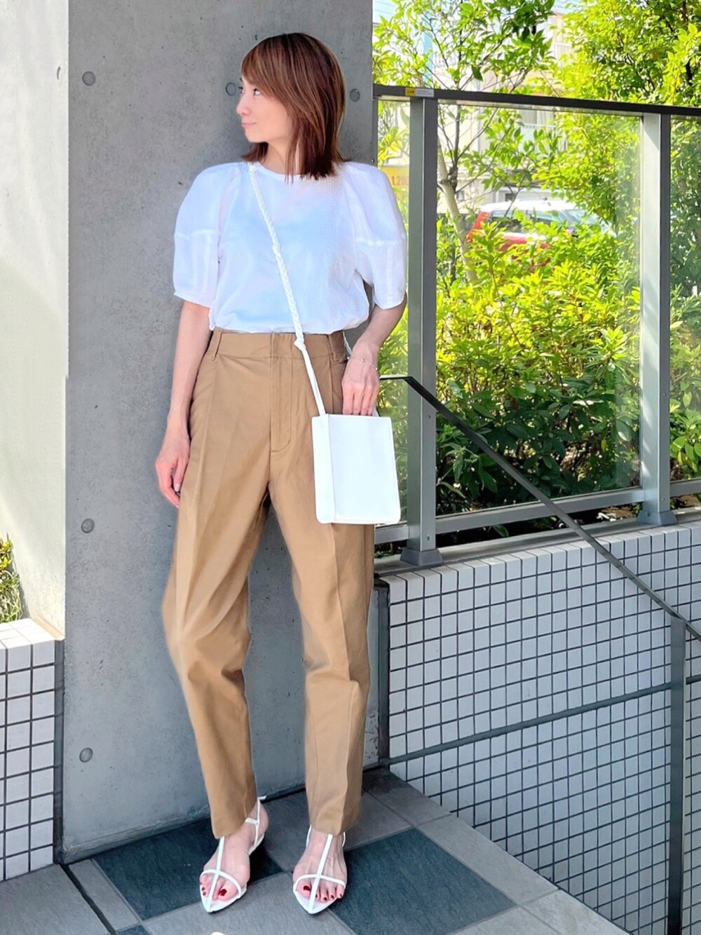 暑いので日陰でパシャり ハイウエストでイン出来るパンツは、簡単にスタイル良く見えるから重宝します◎