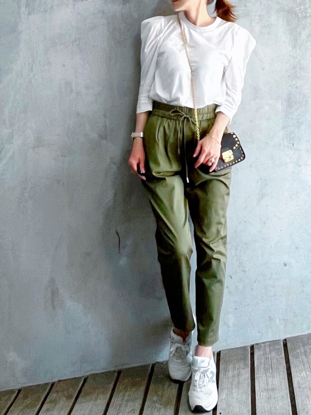 シンプルなカジュアルコーデ 肩のとんがり具合とウエストインでバランス高めが旬ポイント◎
