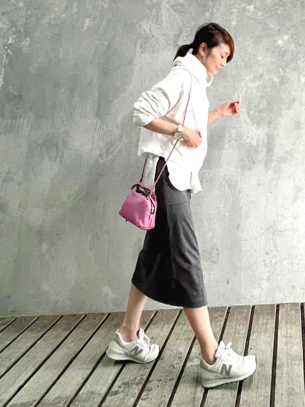 フェイクレザースカート スエード調ですが、履き心地はストレッチが効いてニットスカートみたいで楽ちんです◎ グレーが柔らかい印象になって良きです◎