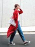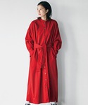 しっかりした素材のシャツワンピを、羽織りで着る◎ 落ち着きある赤が、秋コーデにぴったりです🍁