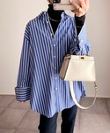 ストライプシャツ✖️ニットベスト emmataylorのビッグカフスが可愛いストライプシャツと、サイドがぱっくり開いたニットベストが相性抜群◎ オーバーサイズシャツもサイドオープンベストならごわつかずにすっきりレイヤード出来るよ◎