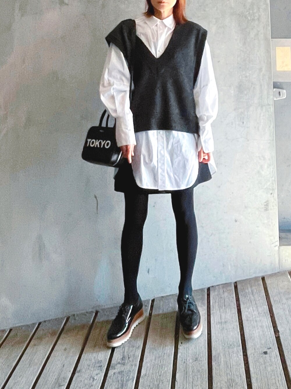 モノトーンコーデ 大好きなベストを追加 前後ともVデザインが新しくて、シルエットもゆるめ◎オーバーサイズのブラウスとのレイヤードにぴったり!