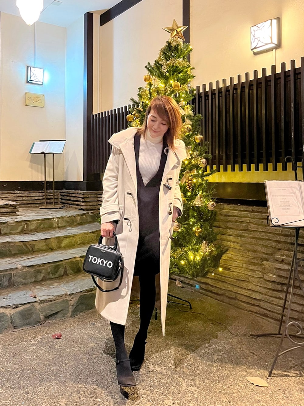 レストランでディナーコーデ Aラインが可愛いワンピースは、インナーを変えると何通りにも着回せる優れ物◎ まずは白タートルを合わせてみました!