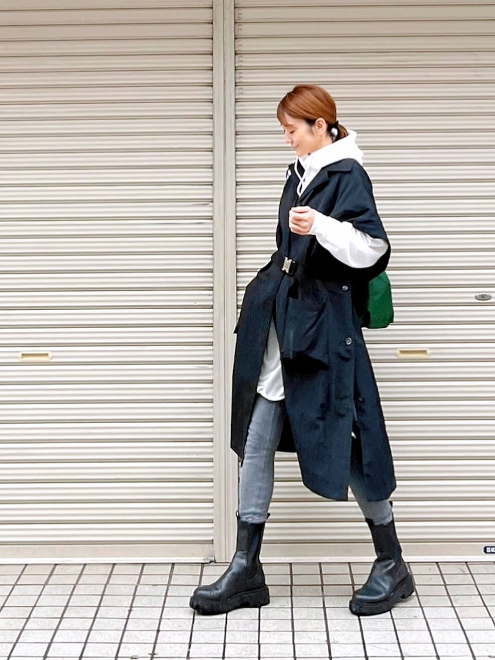 雨の日コーデ☔️ ウエストマーク出来るのがお気に入りのステンカラーコート🧥 パーカーとレイヤードするのもおすすめです😊