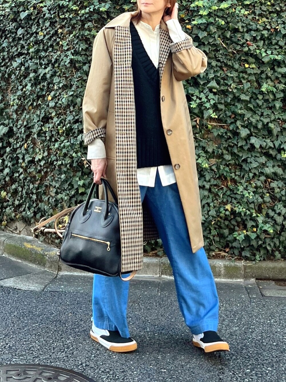 お気に入りのステンカラーコートで🧥 無地の側で着ても、裏のチェックがポイントになります🙆🏻♀️