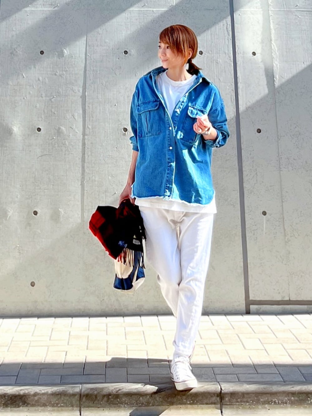 デニムシャツ👔 オーバーサイズなので、インのTシャツもユニクロメンズTのLサイズがぴったりでした😊
