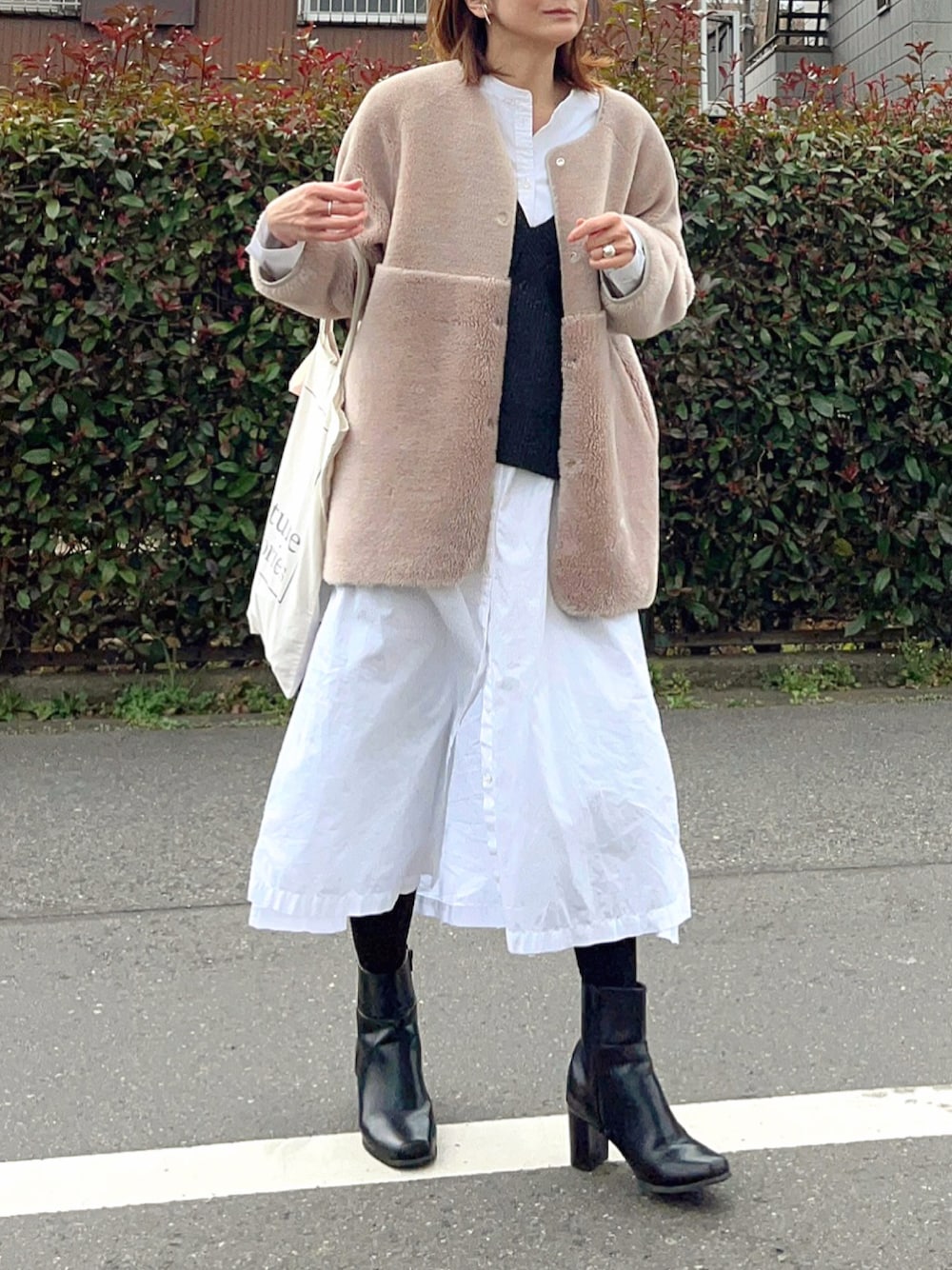 白シャツワンピ✖️ボアアウター ボアが淡い色なので、春コーデでも活躍◎