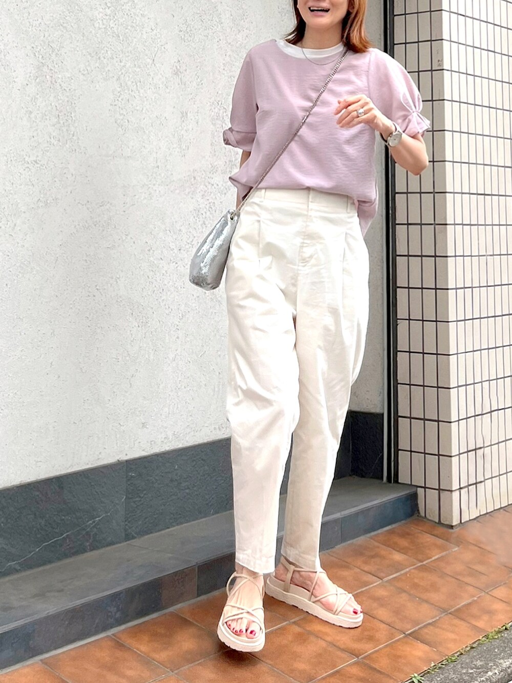 くすみピンクが大人っぽく着られる◎ 袖口のタックがポイントになります! こんなワントーンコーデがオススメ。