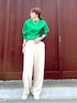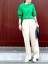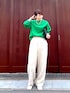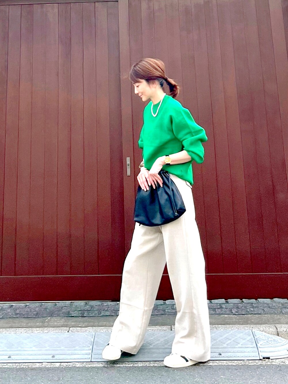 秋一番に着たいカラーニット 今季も引き続きグリーンが気になる◎ ベージュにもブルーにも映える、めちゃくちゃ良い色です! ワイドタックパンツは、ボタンでウエスト調整出来る優れ物。脚が綺麗に長く見えます◎ ニットはラグランデザインがスウェット見えして可愛いから、ネイビーと白も追加したい。