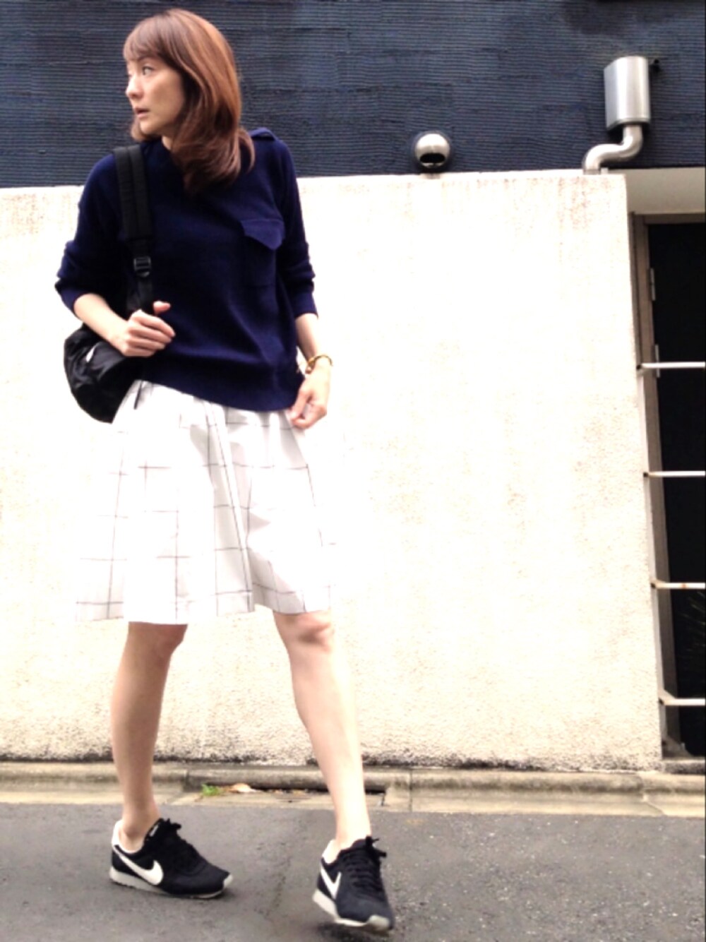 色々歩き回る日は大体こんなコーデ🏃🏃🏃 今季買ったお気に入りのネイビーニットは、肩章や胸のフラップ付きポケットなど、細部にこだわりがあってノーアクセサリーで決まる一着❤️❤️❤️