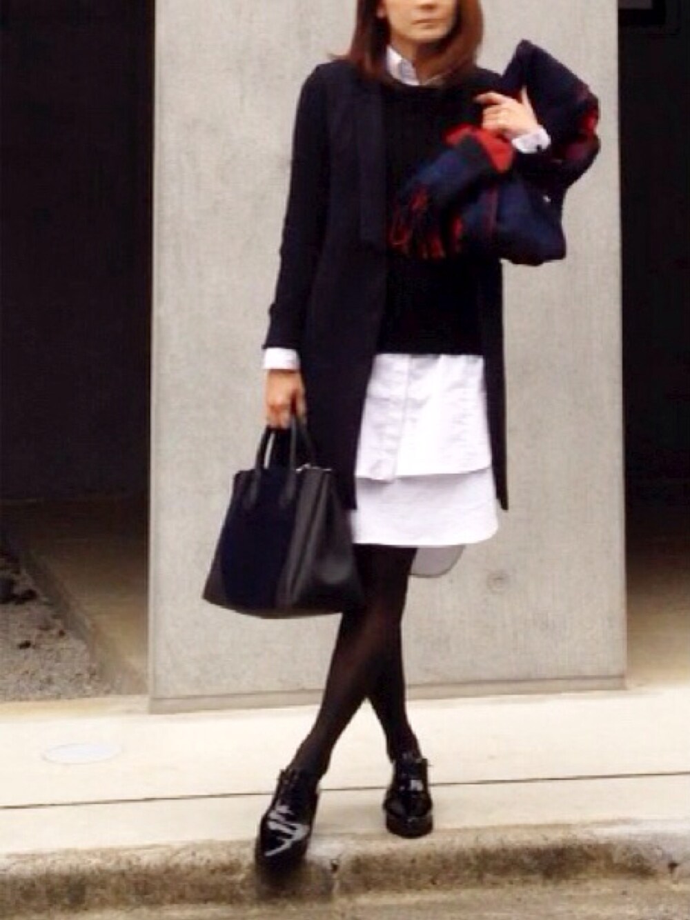 シャツワンピ×チェスターコート風👯💫←ロングジレにカーディガンを組み合わせてます😂 冬のシャツワンピには、少しシアーな黒タイツが合うと思います🙋 そしてシューズは艶感のあるおじ靴で決まり❤️ 首と袖口から見える白シャツが必須💪 チェスター前田ケイン氏、こちらからは以上で〜す🎤