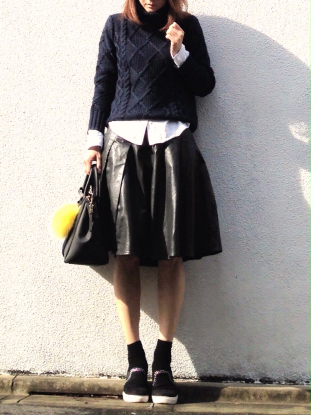 タートル×白シャツ👯💫 昨日は暗くて、柄まで映らなかったけど🙏タートルケーブルニットはこんな感じです🙋 カバンの黄色のチャームは目立つので、見知らぬ方とのトークのきっかけになりますよ←😇?