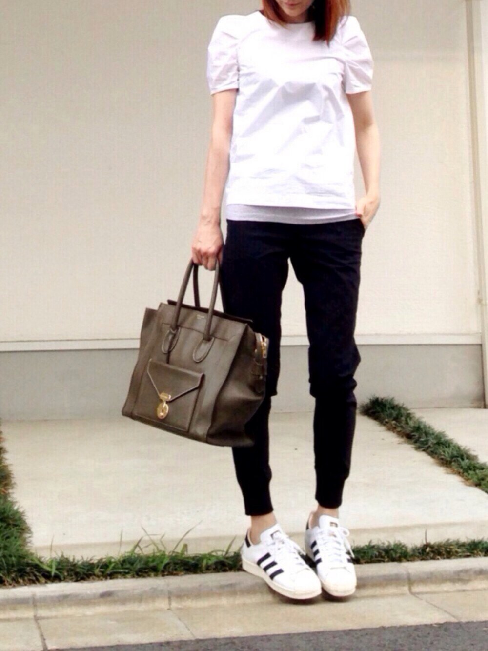 とにかく今季はスポーティなモノトーンが気分です🙋🏻❗️ パフスリーブの可愛いらしいブラウスも、ジョガーパンツとスーパースターでスポーティに😇