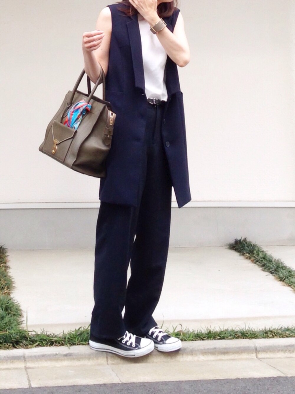 こちらの紺色ワイドパンツ 只今zozoフリマに出品中❗️ 裾が広がり過ぎないので、スニーカーのノーズに裾が乗っかりバランス良く履けます🙆🏻