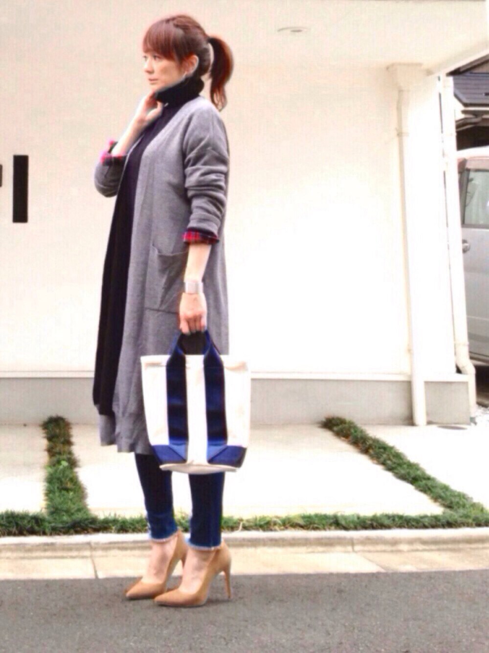 ワンピとカーディガンをレイヤードした袖口から、赤チェックのネルシャツチラ見せ❤️ 誘われてないけど、ネルシャツ週間とチェックシャツ感謝祭に参加🙋🏻 このコーデはめちゃ暖かいから、真冬手前まで着れそう😚👍🏻