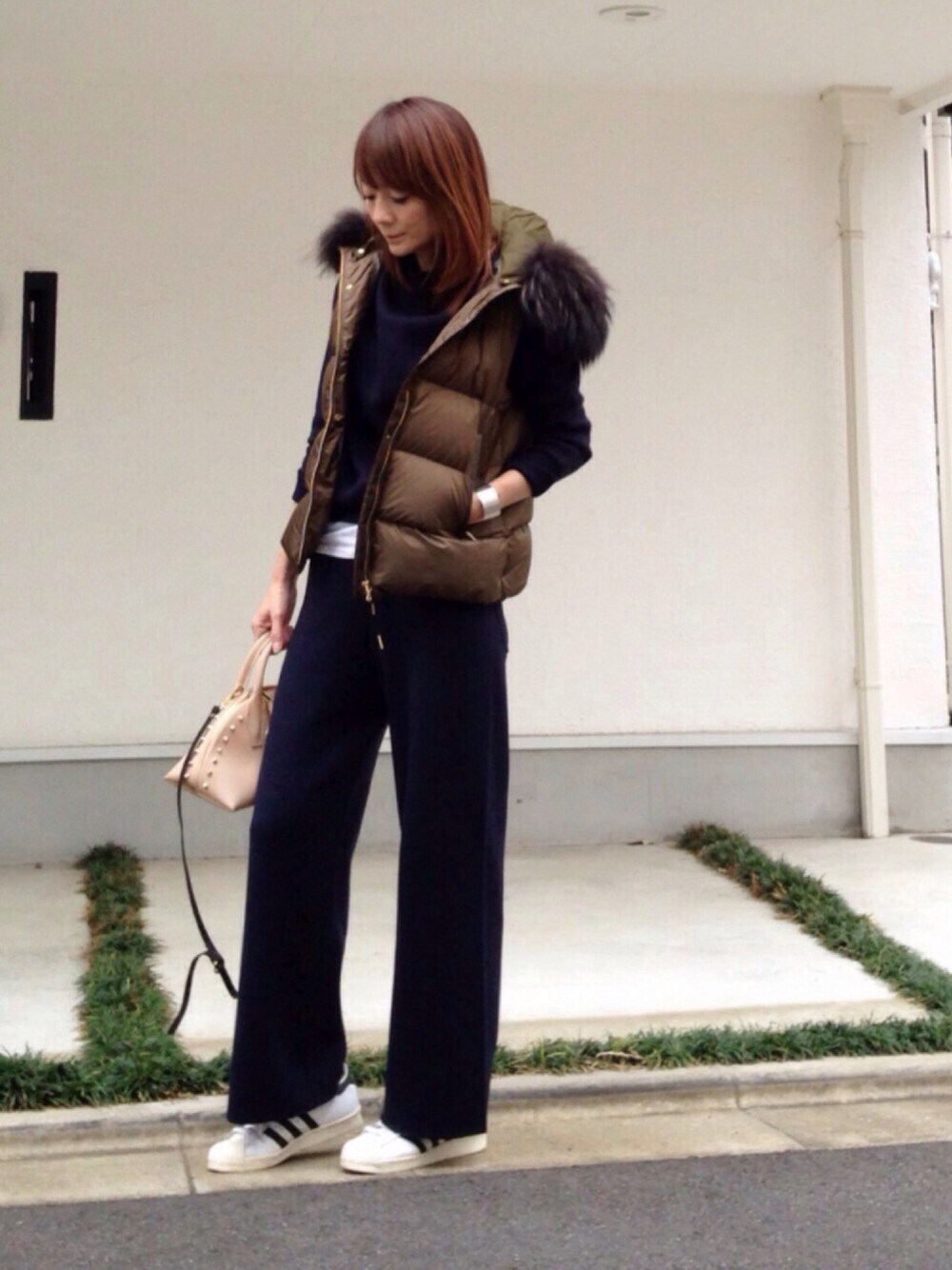 ニットセットアップのトップスとパンツとの間に白インナーを見せるのがポイント🙋🏻 一気に爽やかに〜(๑˃̵ᴗ˂̵)