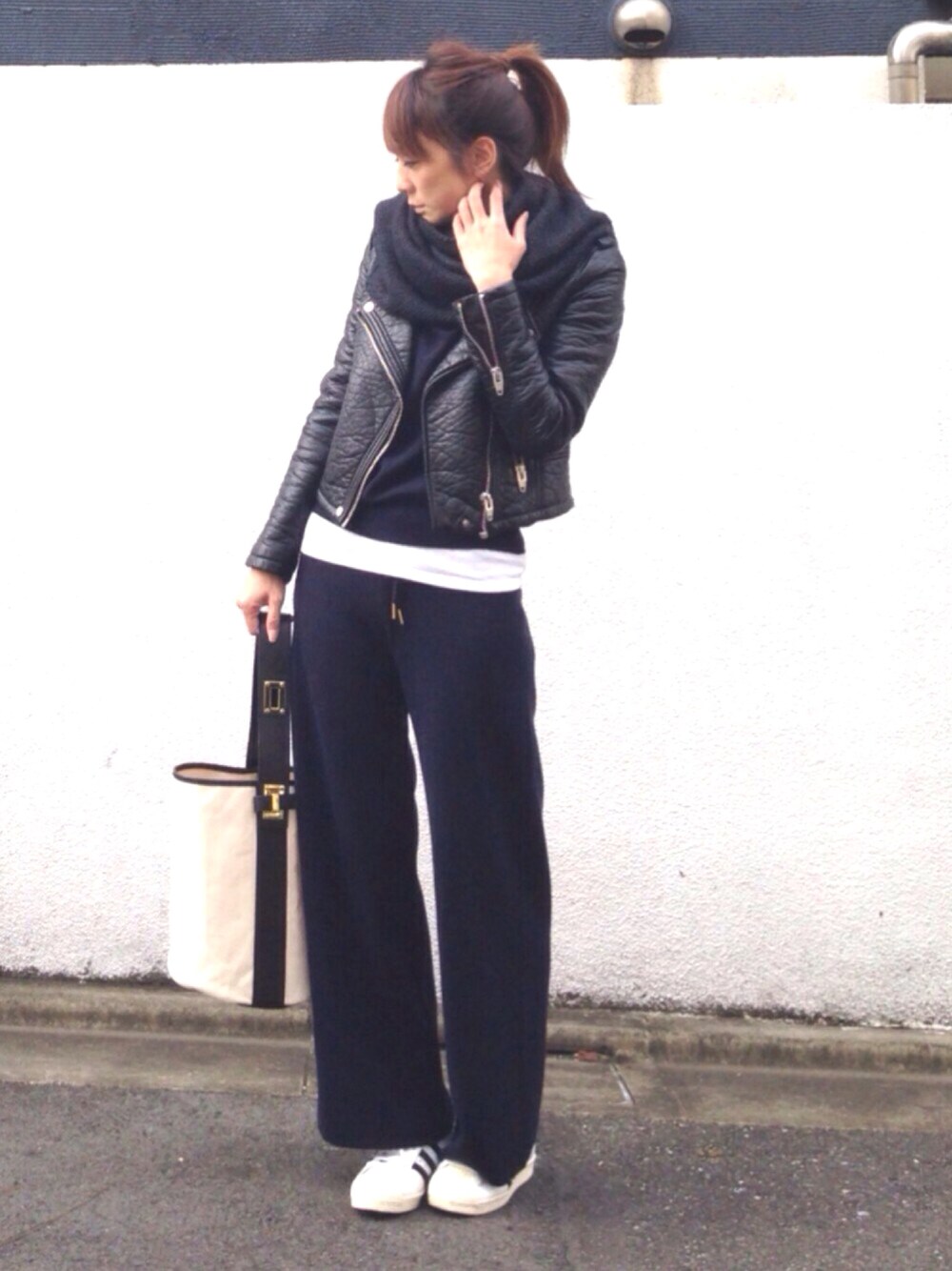 ライダースいぇーーーーい🤘🏻😁 ライダース単品はハードなイメージだけど、ニットアップと首元のニットでニット盛りすれば柔らかくなると思います🙆🏻❗️ バケツバッグで今季っぽく💪🏻