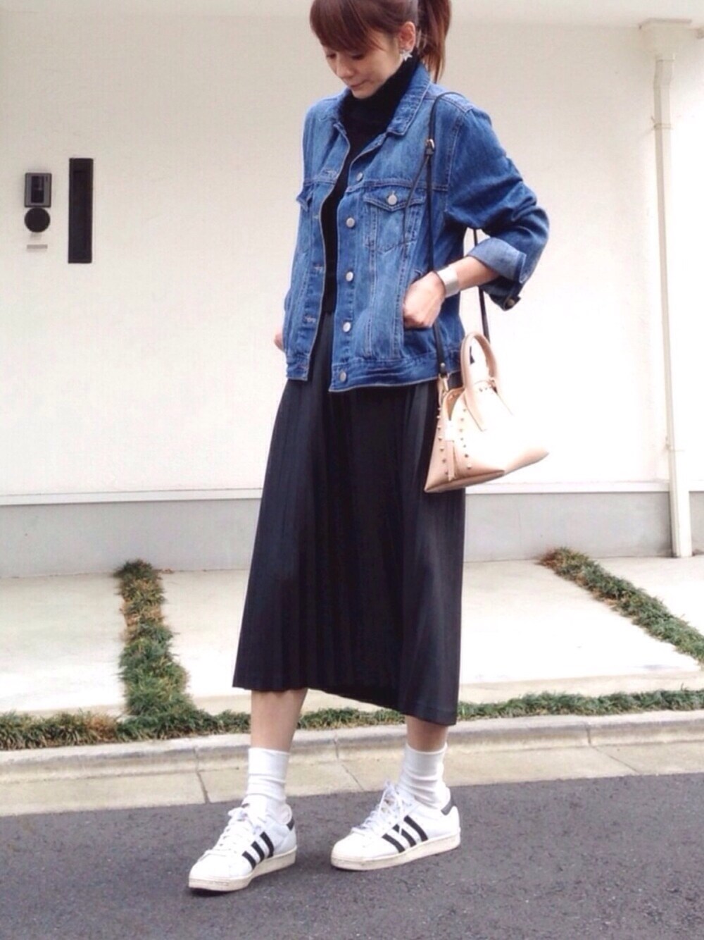 黒革のプリーツスカート × Gジャン😎 ちょい悪なコーデなので、足元は白で明るさアップ🙋🏻‼️