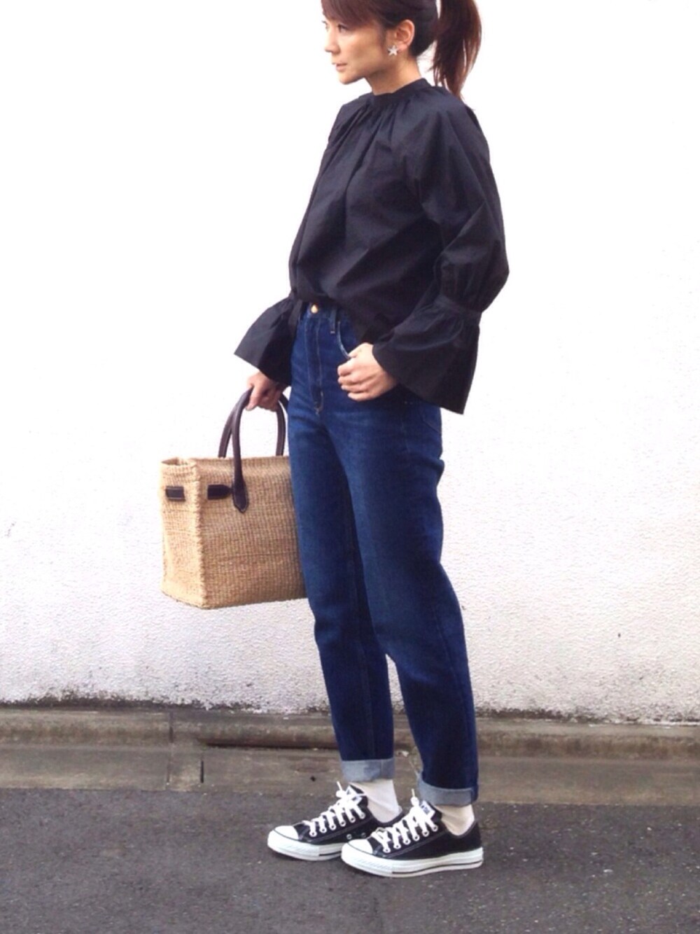 春めいてきたら、こんなコーデでお出掛けしたいな🌸 SLOBE IENA のブラウスは今季流行りのギャザースリーブ😆 足元は白靴下を効かせた黒コンバース🙋🏻
