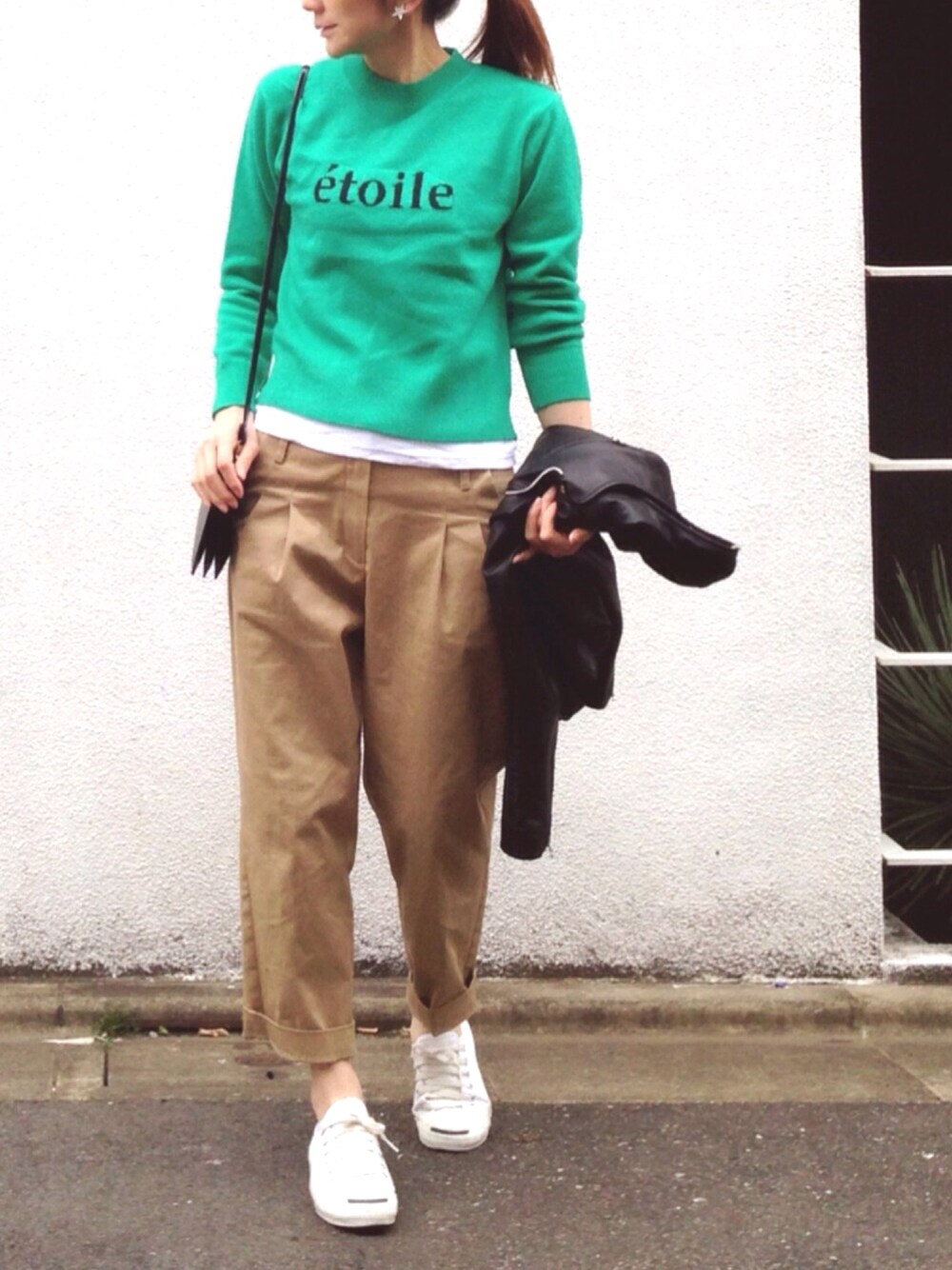 ロゴニット × チノパン😇 ボーイズライクコーデに、鮮やかロゴニットをポイントに🙋🏻‼️ 足元は白で爽やかに🙌🏻