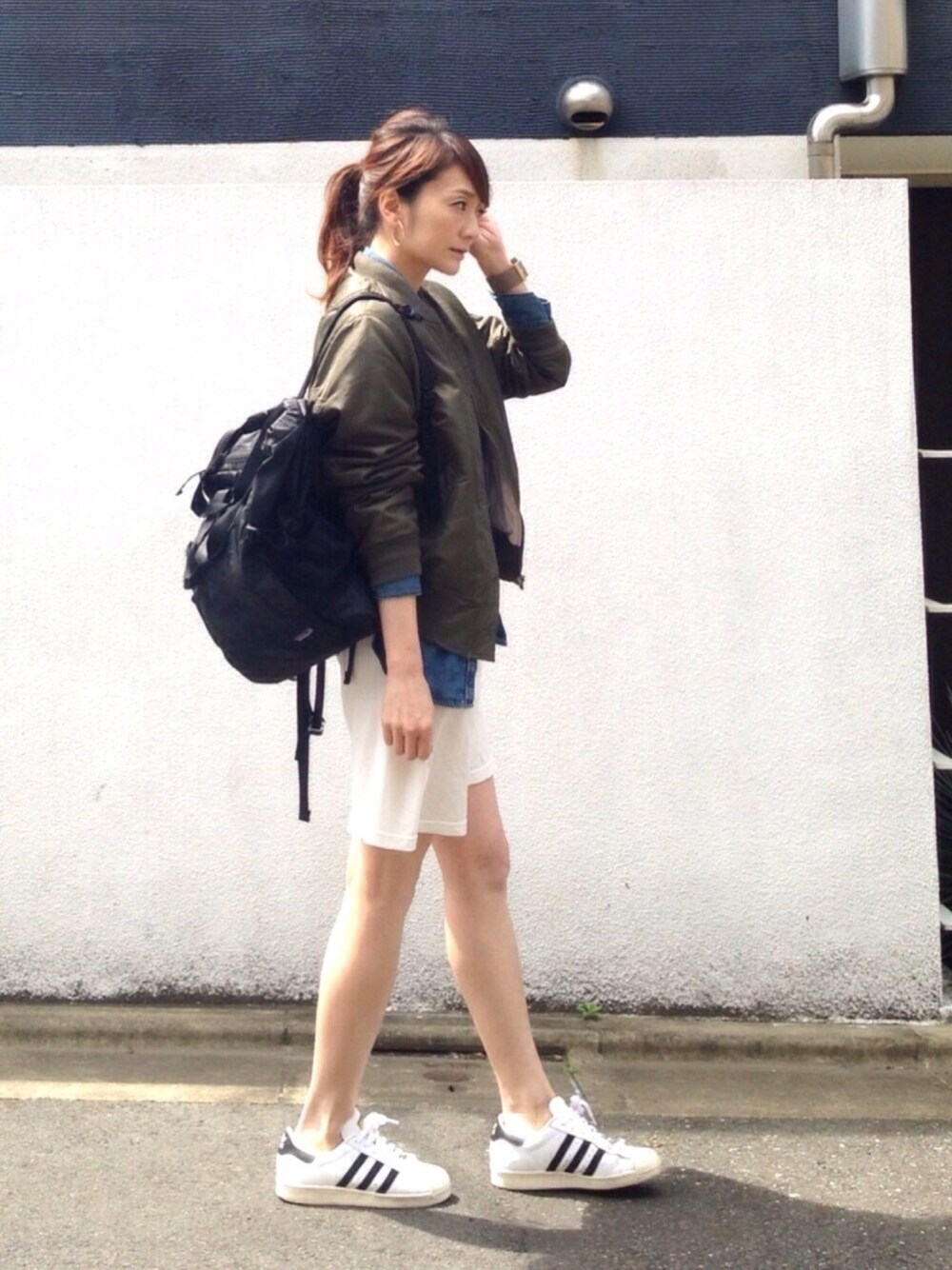 MA-1 × デニムシャツ😃 久しぶりに自分ぽい、スポーツミックスコーデ🙋🏻 MA-1からチラ見えしてるデニムシャツがポイントです🙈💕💕💕