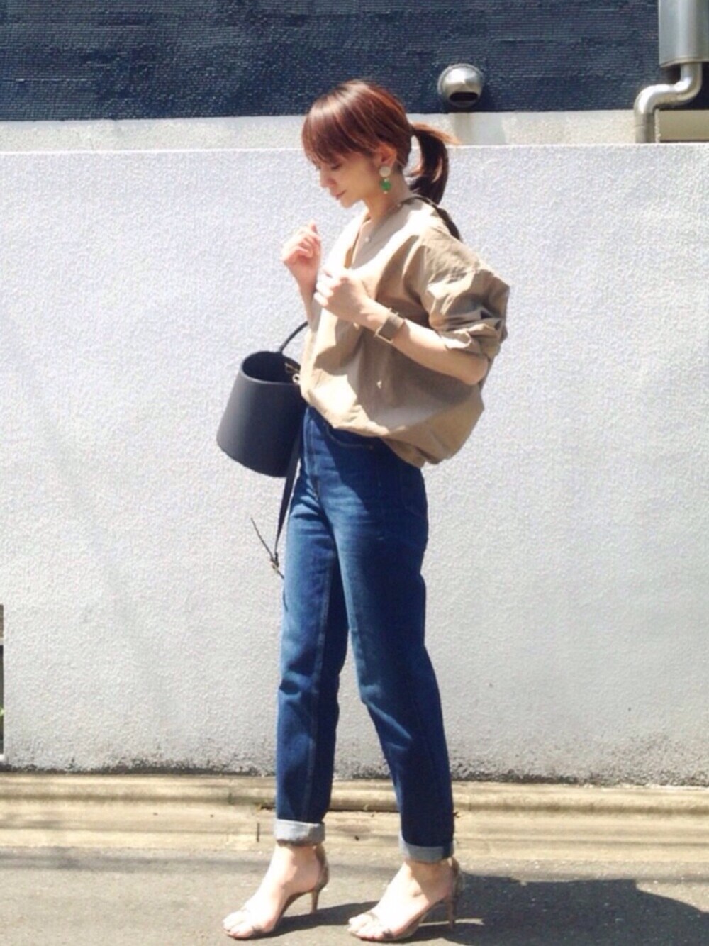 デニムにシャツの定番style🙌🏻 シャツがオーバーサイズで、抜き襟にしてるところがポイントです🙈💕💕💕 夏用に大振りイヤリングをGET。グリーン推しです🙆🏻