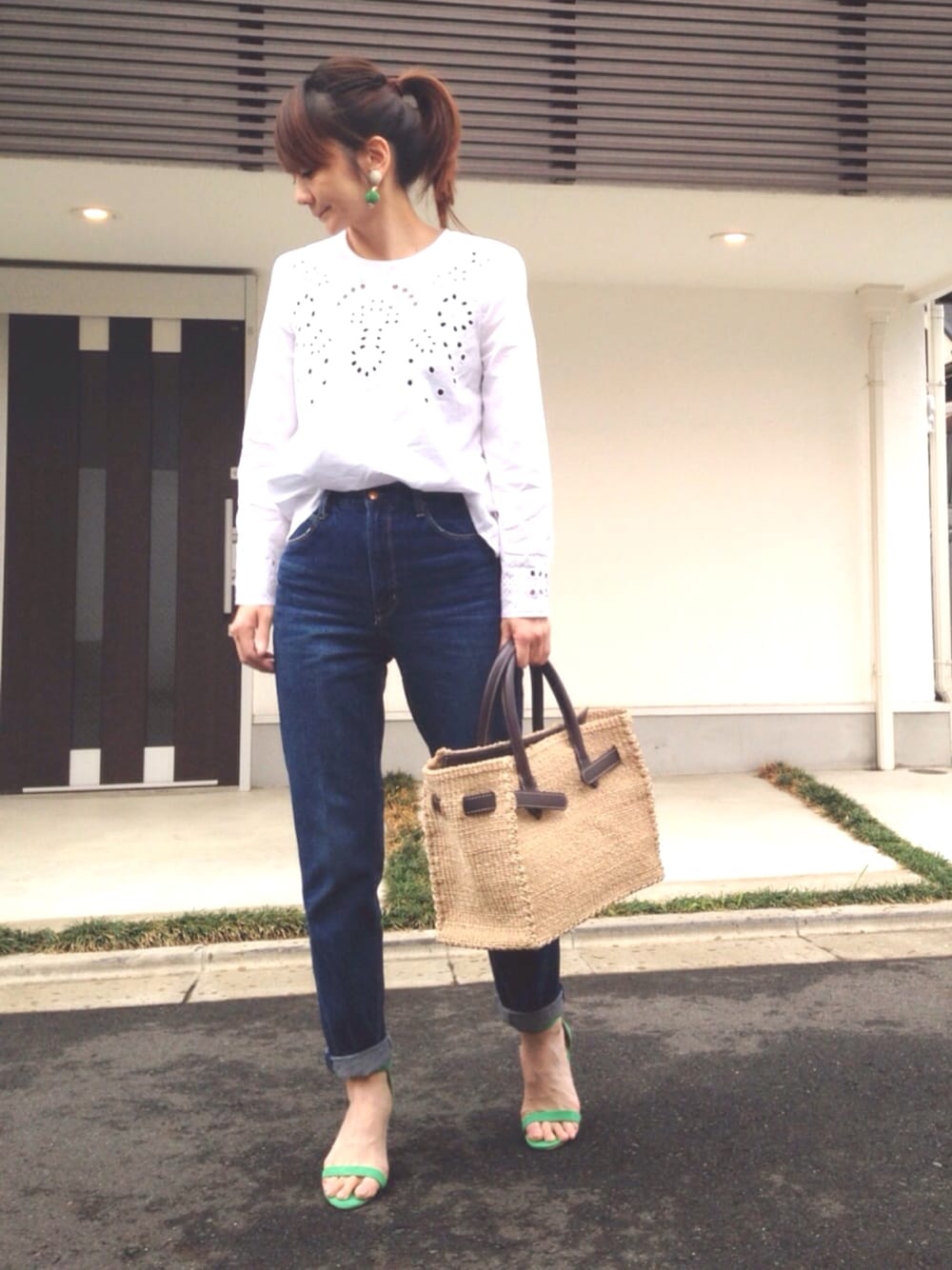 このブラウス可愛い👀✨✨✨ デニムに白トップスだけのシンプルstyleで、こんなに華やかになるなのはカッティングレースのお陰です🙋🏻‼️ 最近マイ流行りのグリーン小物と🤢