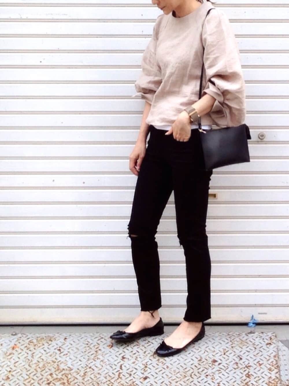 袖ボリュームブラウス × 黒スキニー ブラウスが印象的なので、後は黒でまとめてスッキリと😎 ブラウスはカフスを折り返して、袖を少しまくって手首を見せて着ると、とっても可愛いです🙈💕💕