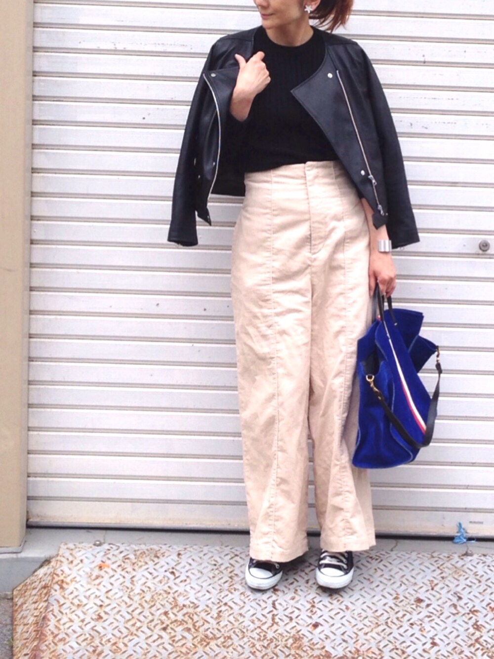 パンツのハイウエスト具合がポイントです👖 夜のお出掛けには、ライダースをお供に😎
