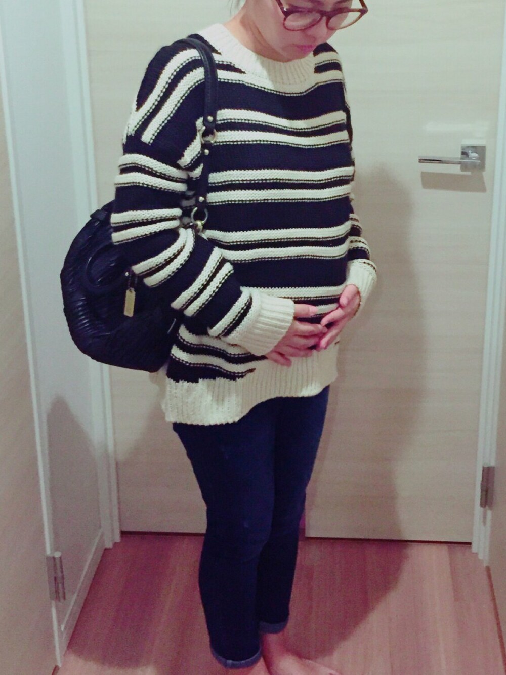 お腹出始めた、マタニティコーデ①♡♡♡ H&Mのデカめニットでお腹を目立ちにくく。