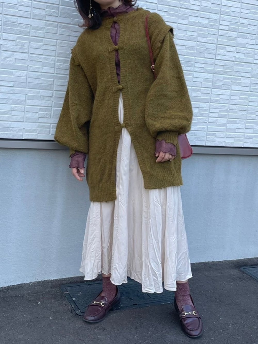 グリーン×パープルって意外と可愛い気がする!💜 今日は少し暖かかったから薄手のインナーに ニットカーディガンのコーデ☺︎ インナーや小物、シューズ系を赤系統で合わせてみました!