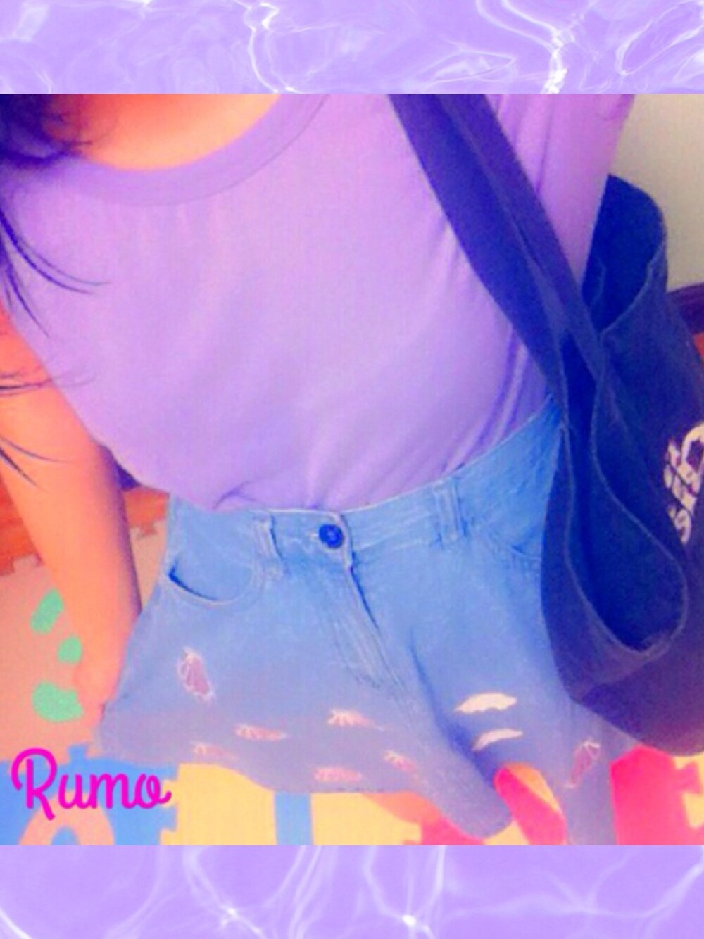ブルー系のスカート、パープル系のシャツ/ブラウス、ブラック系のトートバッグを着用したレディースの夏コーディネートの1枚目の写真