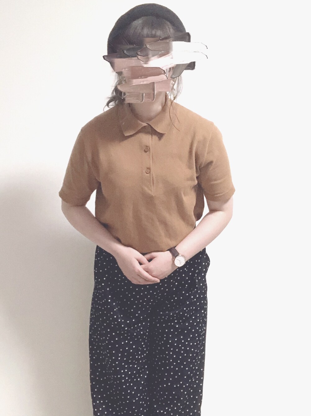 あんまり半袖着たくないけど さすがに暑かった☀️ ポロシャツは色味が好きで メンズのだけど購入👕 ニットだからダボっとせず 少しぴったり目できれいに着れます👌 髪は耳の下あたりでお団子して サーモベレーもポンっと👒