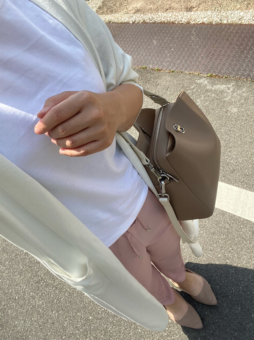 ホワイト系のTシャツ/カットソーを着用したレディースの春コーディネートの1枚目の写真