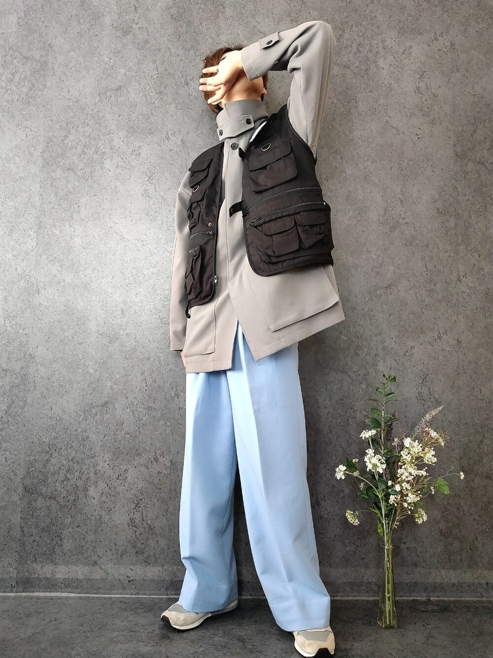 おはようございます☀️ルナラビです! いつもいいねと保存ありがとうございます! 今日は古着のベストを使ってレイヤードコーデを組んでみました😎 いつもフォルダインありがとうございます! 【コーデのポイント】 ①トレンドであるカラーパンツを着用していること。 ②アウターのグレーとシューズのグレーを統一させることでコーデに統一感を与えていること。 ③ミドル丈のブルゾンとショート丈のベストで着丈差を作ることでスタイルアップを図っていること。 これら3つのことから差別化レイヤードコーデを組むことができます😊 ぜひ真似してみてね✨ かくいう僕はKEI(犬飼 京)くん@hellokeisuk のポージングを真似てみました👍