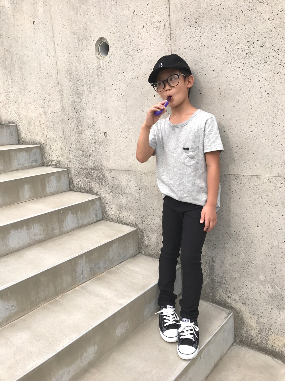 おはようございます🎶 ご覧いただき、ありがとうございます😊 台風が近づいてきてますね🌫 鹿児島の方は暴風域に入ったようで💦💦 福岡の実家が心配です😥 みなさん、気をつけましょうね! 先日、次男が「写真撮っていいよ」といきなり許可してくれたので、次男1人で😄 ちょうどミニオンの飴を食べてたので、そのまま撮りました😅 場所はふと思いついて、外の階段で😊 母が送ってくれた西松屋のキャップとストレッチパンツ✨ 写真撮ってて思ったんだけど、このストレッチパンツ、足長効果がすごい‼️ わが子ながら、こんなに足、長かったっけ?と思ってしまった😂 色違いで欲しくなり、衝動買いに走りそうなところをグッと我慢😆 朝から長々とすみません💧 いつもいいね、お気に入り、コメントありがとうございます💕 とてもうれしいです🎶