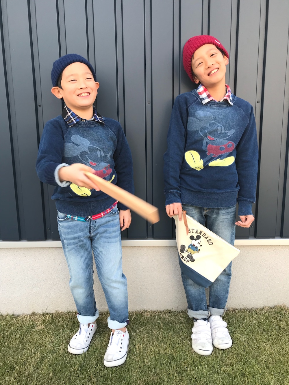 おはようございます☀ ご覧いただき、ありがとうございます😊 またまた一目惚れのミッキーのスウェット😍 キナリとかグレーとかあったけど、見た瞬間、このネイビーに😍😍😍 130しかなくて、長男の140がなかったんだけど、どうしてもあきらめきれない私は、実家のある福岡の店舗に問い合わせしてもらい、お取り置き💕 母に頼んでおそろいで着せることができました😃✨ まずは定番のデニムで。 シャツも入れて大好きな冬コーデ🎶 いつもいいね、お気に入り、コメント、フォローありがとうございます! とてもうれしいです😆