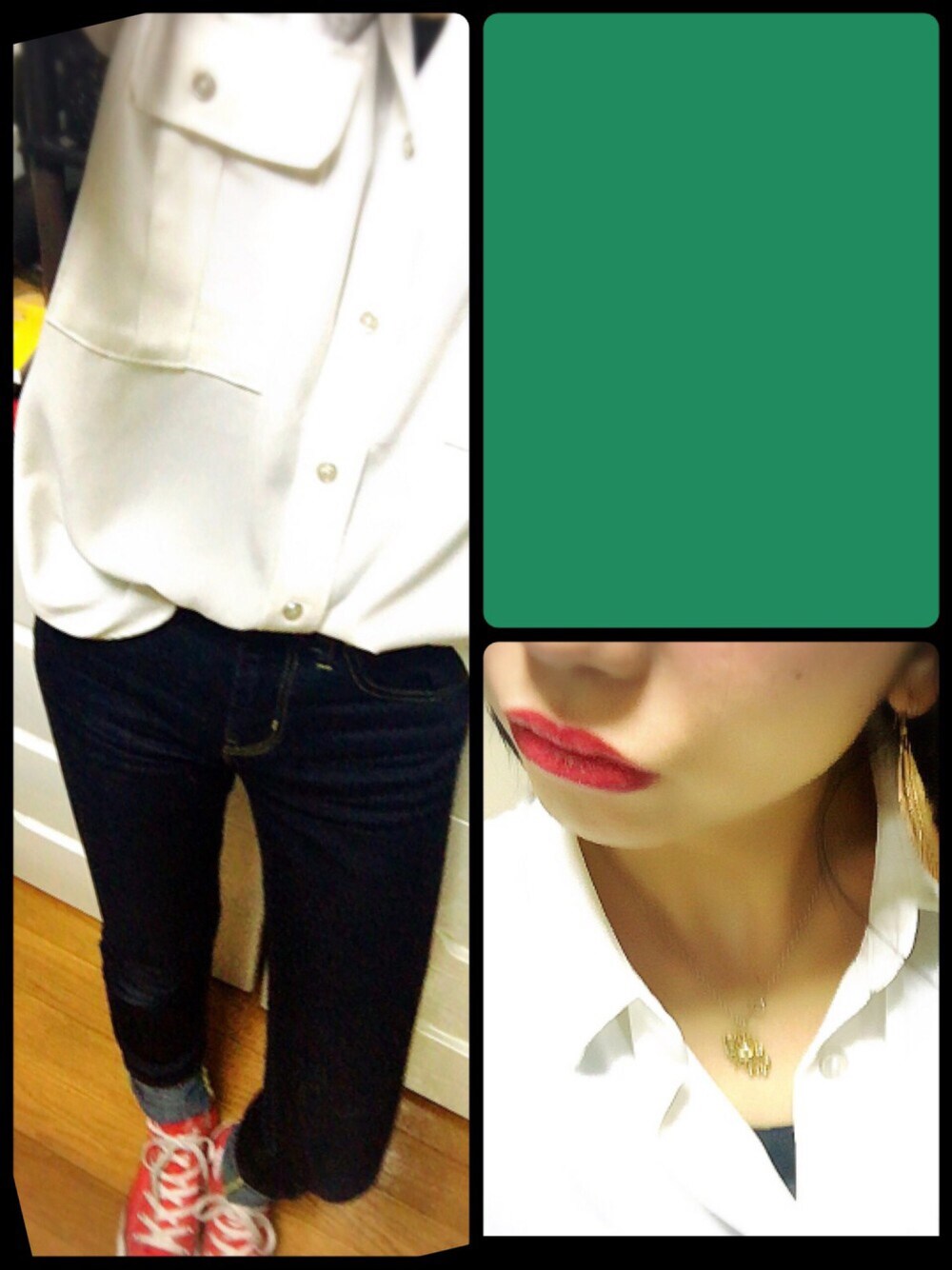 ゆるテロなシャツは前だけタックインして(^p^) ミニタリーシャツだけどあえてのホワイトチョイス(^p^) しかし昼間はよかったけど夜はまだ寒すぎた。泣 コンバースの赤とリップの赤合わせてみました。