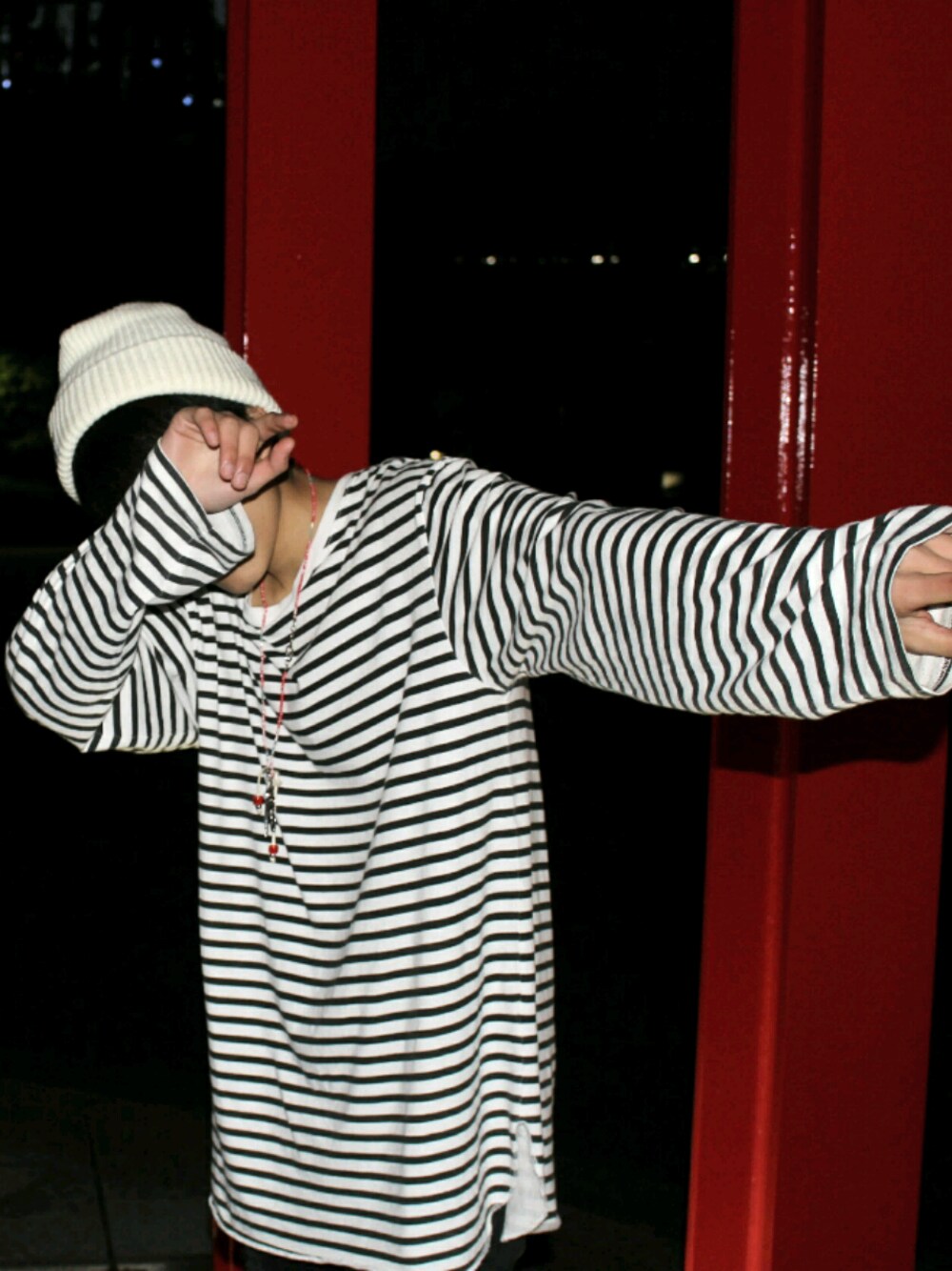 ロンTのボーダー柄と白のニットでGDをイメージ
