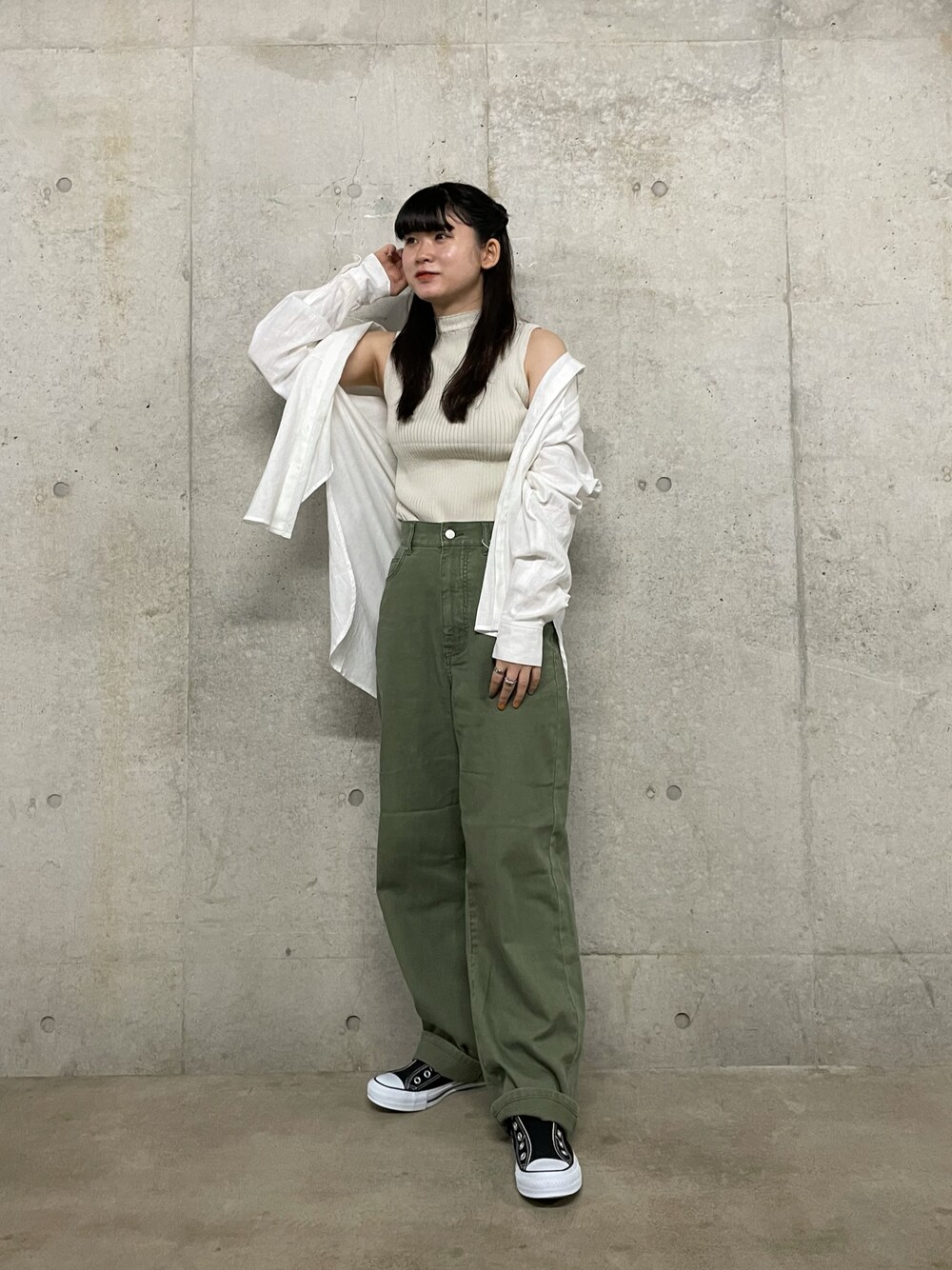肩を出すことによって堅苦しさがないコーデに仕上げました。