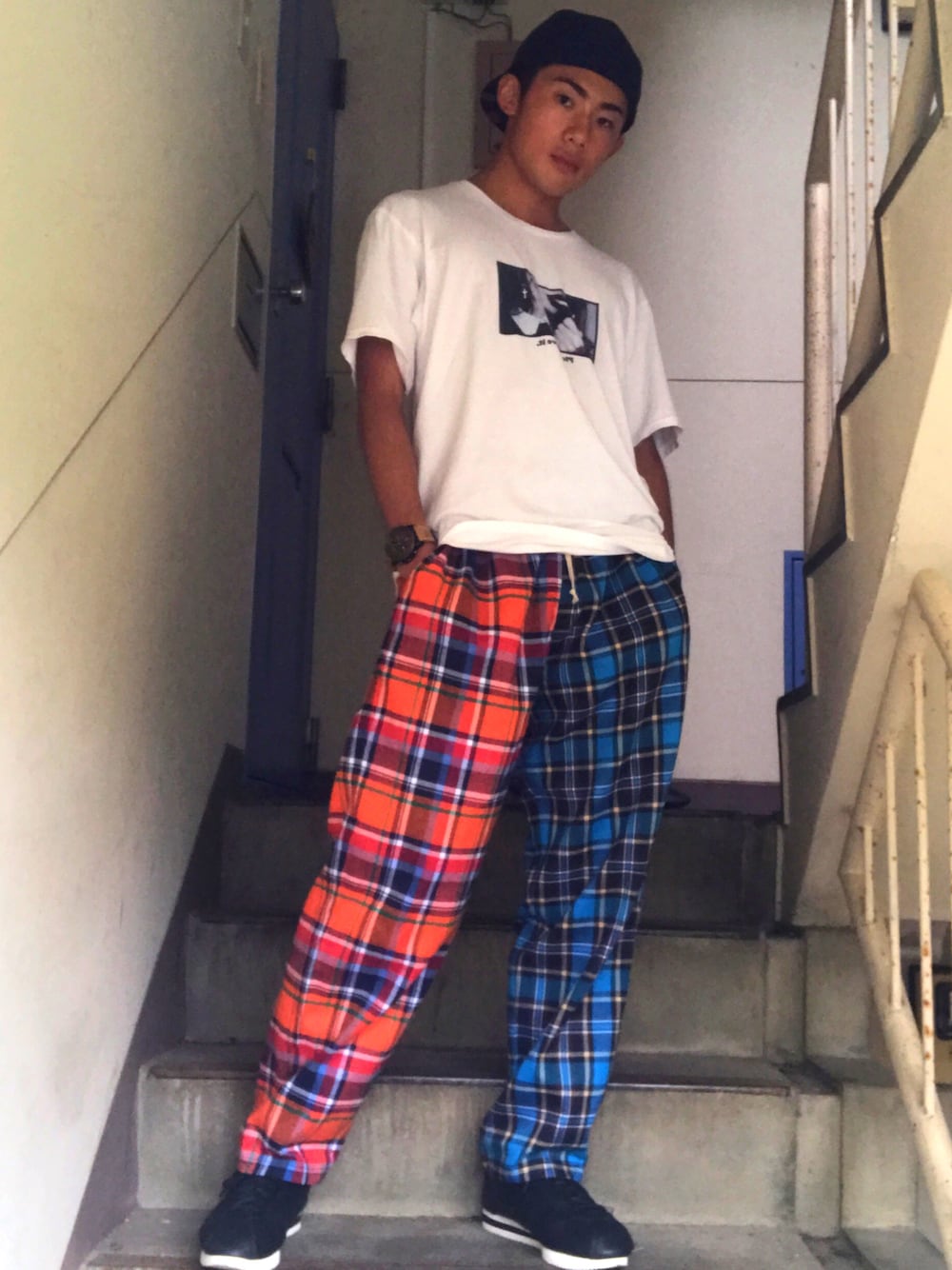 めずらしくワイドパンツ! 派手だけどかわいくてめっちゃ好き😍 レザーコルテッツみたいな渋いスニーカーと合いますねww あと今までの写真は顔隠してましたがインスタ今回からは普通に顔出しますw いちいち隠すのめんどくて😅😅