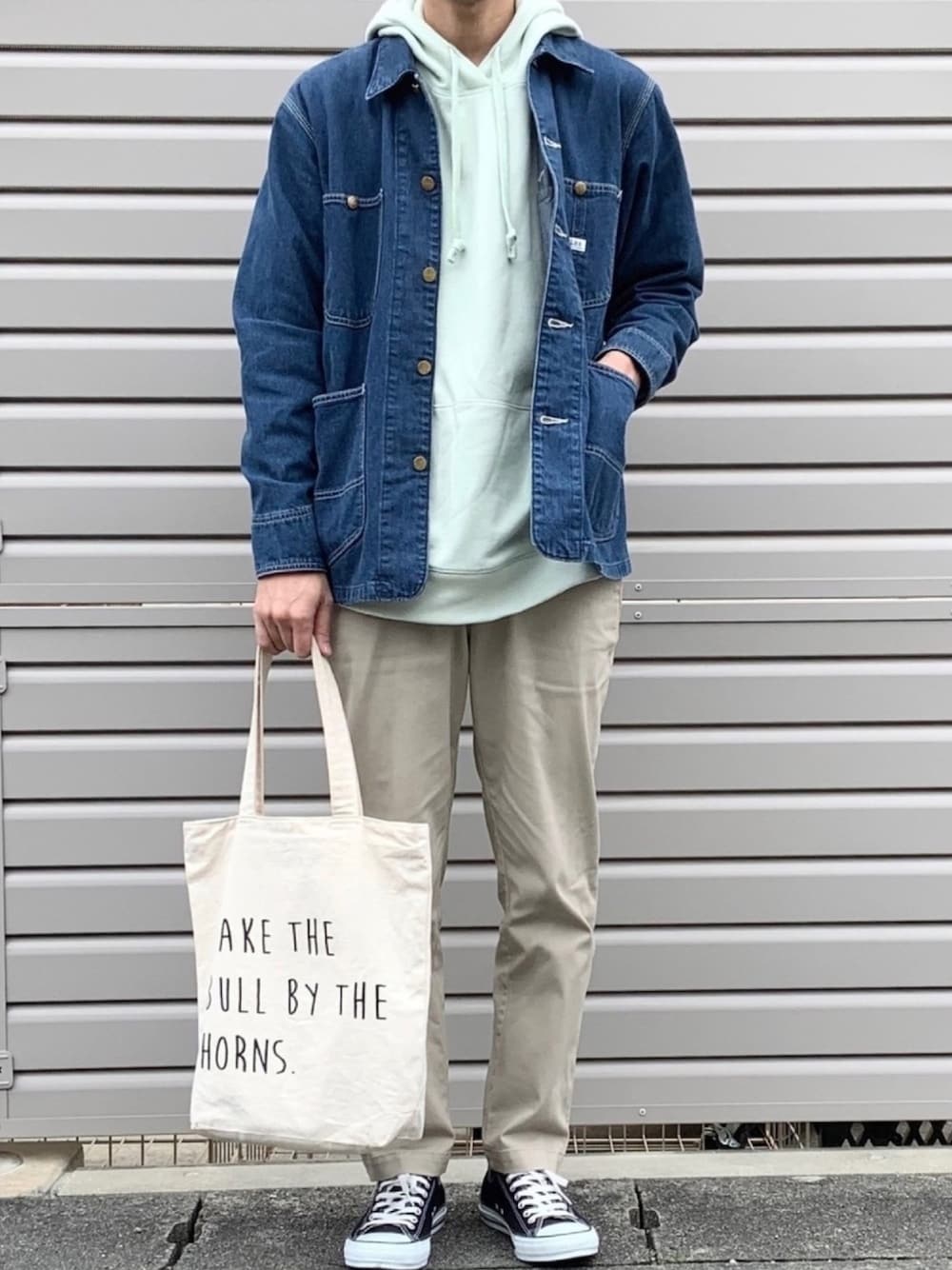 春コーデ。 トップスとパンツをペールトーンにしてデニムのカバーオールでまとめてみました😎