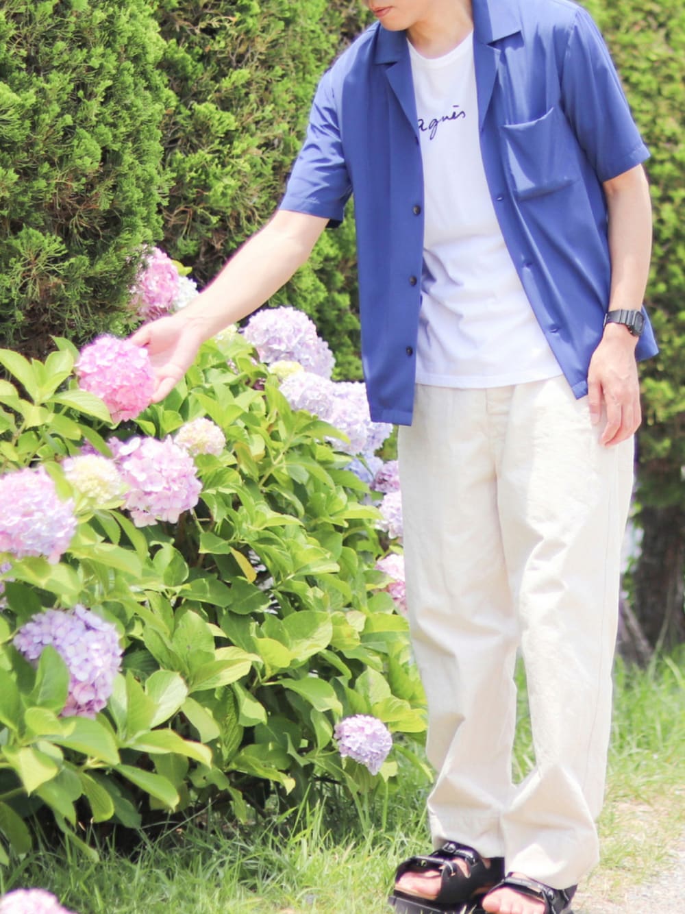 コーデがうまく撮れなかったので、紫陽花と遊んでるとこを撮りました😂笑 今の時期は紫陽花が綺麗ですね😃