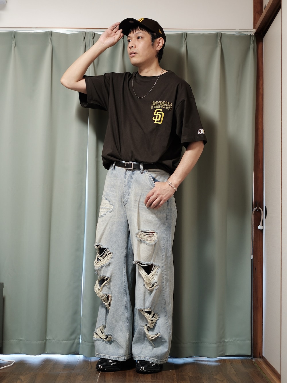 40代お洒落コーデ🧔♂️ 40代でもお洒落に見えるコーデを組んでみました🙆♂️ ダメージデニムは少しやり過ぎな気がしましたが、MLBのシャツと合わせれば色の相性もいいのでまとまります👕 タックインをすることで足長効果でスタイルがよく見えるのもポイントです👍