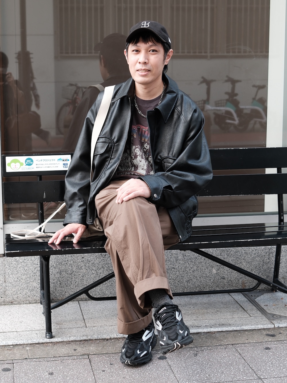 40代お洒落コーデ🧔♂️ レザーを使った秋コーデを撮ってみました📷 とても暑かったです笑 ブラウンのパンツにすることで秋らしさを出してみました🍂