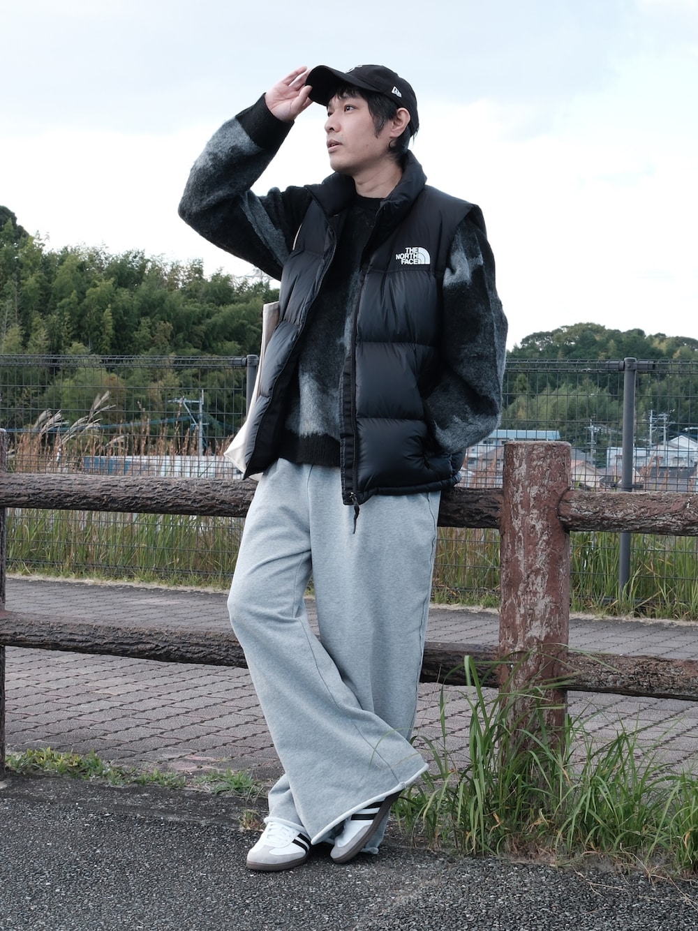 40代お洒落コーデ🧔♂️ ノースフェイスのダウンベスト着てみました😎 スウェットパンツとシャギーニットを合わせて今風なコーデにしました🙂